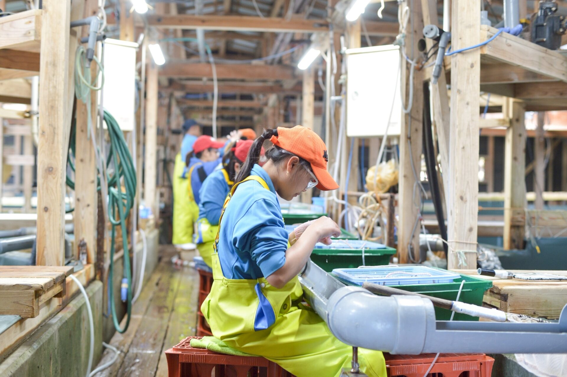 そんなFUKUNOTANEが、2025年5月、新たな一歩を踏み出しました。兵庫県からの中学生を迎え、初の修学旅行を受け入れたのです。2週間後、大阪府からも中学生が来訪。修学旅行での一日は、生徒たちにとって滅多にない“魚と向き合う一日”でした。この修学旅行が他にない特別な体験となる理由は、FUKUNOTANEの“現場力”にあります。種苗生産から、稚魚の養殖、そして加工・出荷までを一貫して担うFUKUNOTANEだからこそ、生徒たちは「魚の一生」を丸ごと体感できるのです。